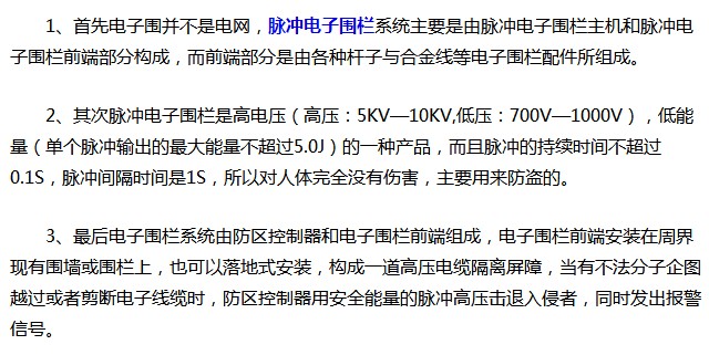 电子围栏的主要作用是为了防盗报警,如果误碰了电子围栏的合金线一般会触电但是时间非常短大概在0.1S左右具体要看你购买的产品功能参数,在机器没有故障的情况下应该还是在安全范围内的但是不排除有些三无厂家生产的产品其安全性能不达标也有可能发生严重的人身伤害事故所以建议大家购买电子围栏这类的产品请选择知名品牌公司出品的产品如果杭州的海康威视还有大华这些安防行业的知名品牌。