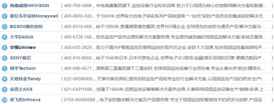 监控摄像头品牌排行如上图所示(图片来源于网络不代表本站),目前安防市场上的主流摄像头品牌如上图所示其中海康威视、大华科技、天地伟业是目前国产监控摄像头市场份额最高的价格品牌而一些洋品牌如索尼、博世这些品牌的摄像头虽然品质上是非常不错的但是价格却是国产的好几倍所以市场份额不是很高如果考虑性价比那么海康大华是你不二的选择。