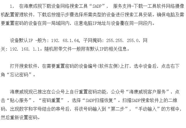 以海康威视的监控摄像头忘记密码为例主要的操作方法是首先用一台接入监控网络的电脑上下载一个海康威视的SADP的软件安装好后可以扫描局域网中所有的摄像头扫描出遗忘密码的摄像头然后点击密码进行摄像头密码重置操作。