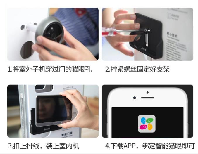 安装萤石云电子猫眼的方法其实非常简单,首先拆下家里防盗门的旧猫眼然后插入萤石云猫眼镜头端然后在门里面对应位置安装好显示屏支架把镜头段的排线与显示屏对接即可安装完成,具体操作方法见下图: