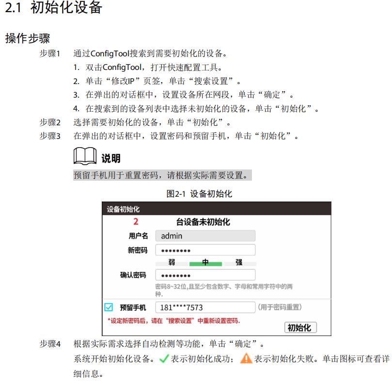 4. 在搜索到的设备列表中选择未初始化的设备,单击“初始化”。 步骤2 选择需要初始化的设备,单击“初始化”。 步骤3 在弹出的对话框中,设置密码和预留手机,单击“初始化”。