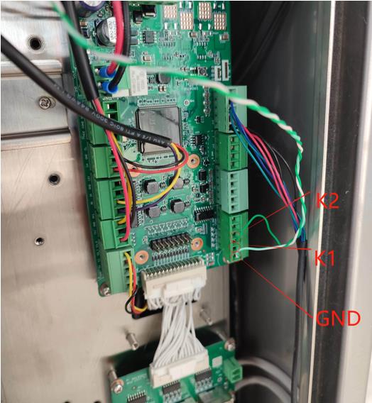 解决办法应该是入口侧接K1,GND出口侧接K2.GND。
