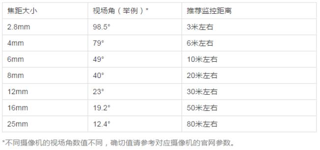 您好,请根据您的需要来选择镜头毫米数。 焦距与视场角的大小举例如下图所示: 焦距与监控距离远近的关系如下图所示: 例如,200W的摄像头,4mm的镜头,可以看清1.5*4=6米处的人脸或者车牌,3*4=12米处的人体轮廓,6*4=24米处的人物活动信息。 【此表的参数仅供参考,具体在选型的时候,建议与销售人员详细说明应用场景,及自己的需求,参考销售人员的型号推荐】