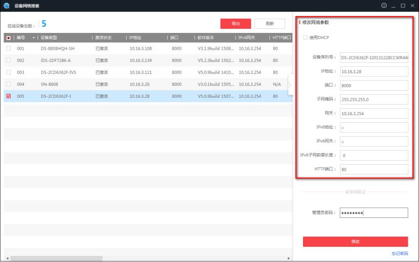 3、左侧勾选需要修改的设备,右侧“修改网络参数”中修改对应信息(IP、子网掩码等等),输入待修改设备的管理员密码,点击修改。